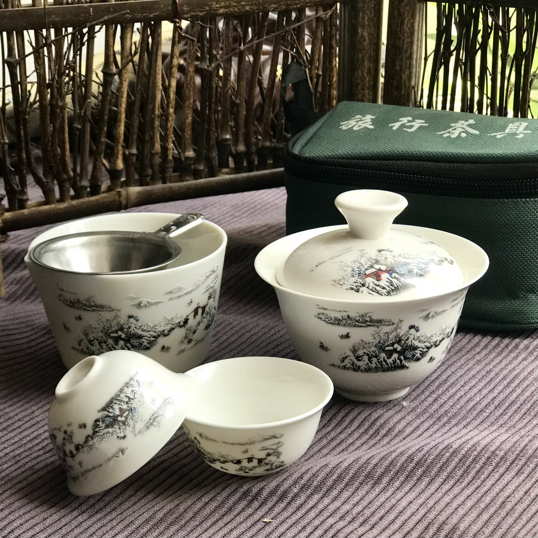 Набір посуду для тих, хто постійно п'є чай. Невелика сумочка з посудом, розміром лише 15×9×8 см, не займає багато місця. Її навіть можна підвісити на ремінь.