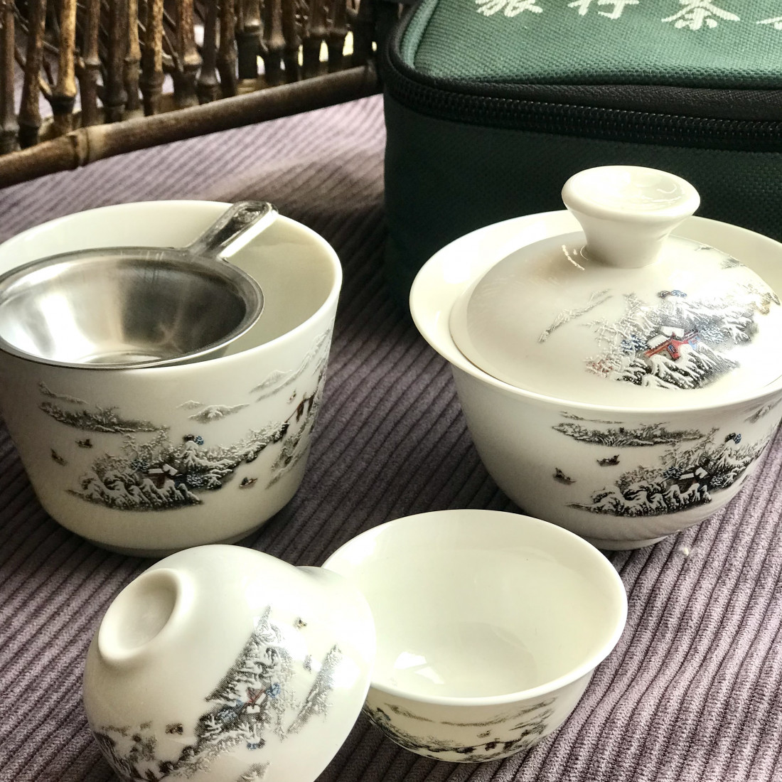 Дуже тішить те, що в наборі посуд більше, ніж у стандартних наборах для подорожей. Тобто цей набір точно підійде на компанію 4-6 осіб. У сумочку міститься 6 чаш (25 мл), гайвань без блюдця (100 мл), чахай (130 мл), залізні ситечко та щипці. За бажання там можна помістити ще 1-2 пробники чаю.