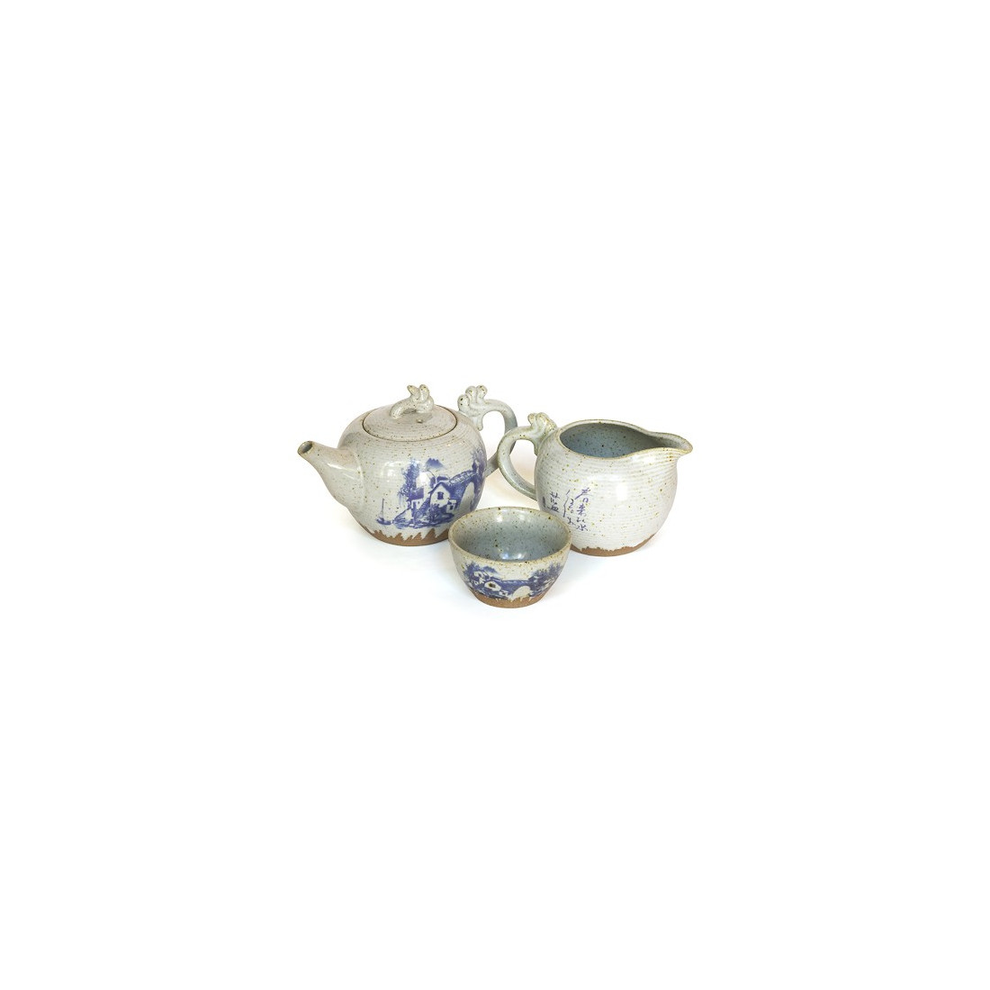 Керамічний набір в стилі тайвань. Зліплений із глини, покритий сірою емаллю в цятку, а поверх емалі нанесено зображення у традиційному китайському стилі.