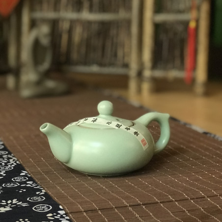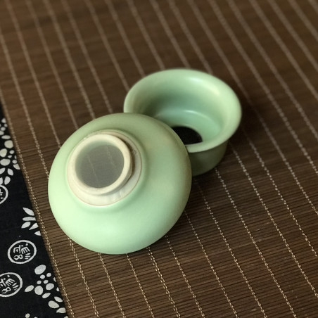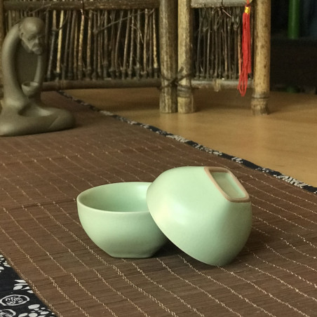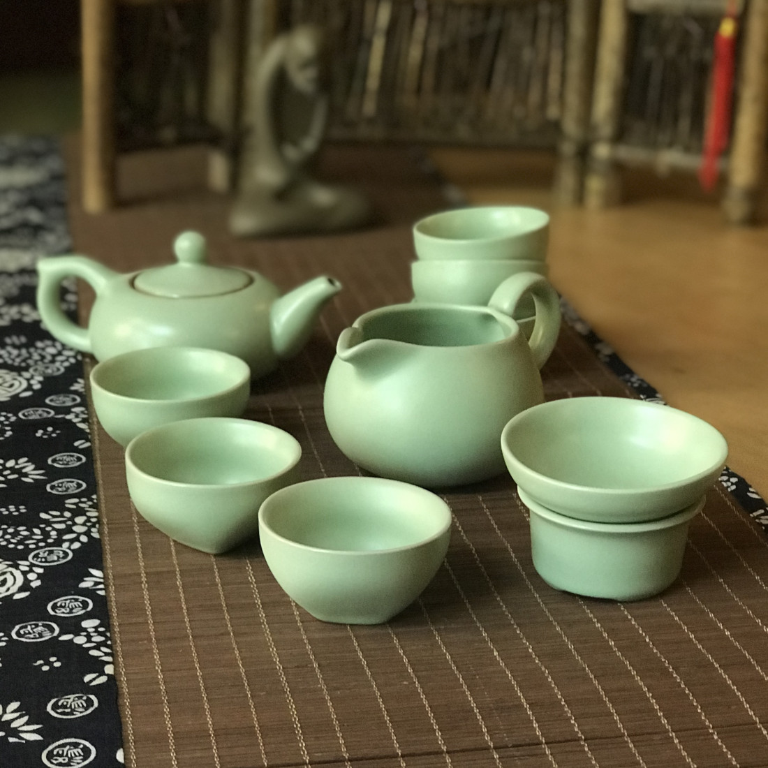 Сервіз для чаювання виконаний з кераміки жуяо ніжно-зеленого кольору (тяньцин, 天青). Класична кераміка без малюнка.