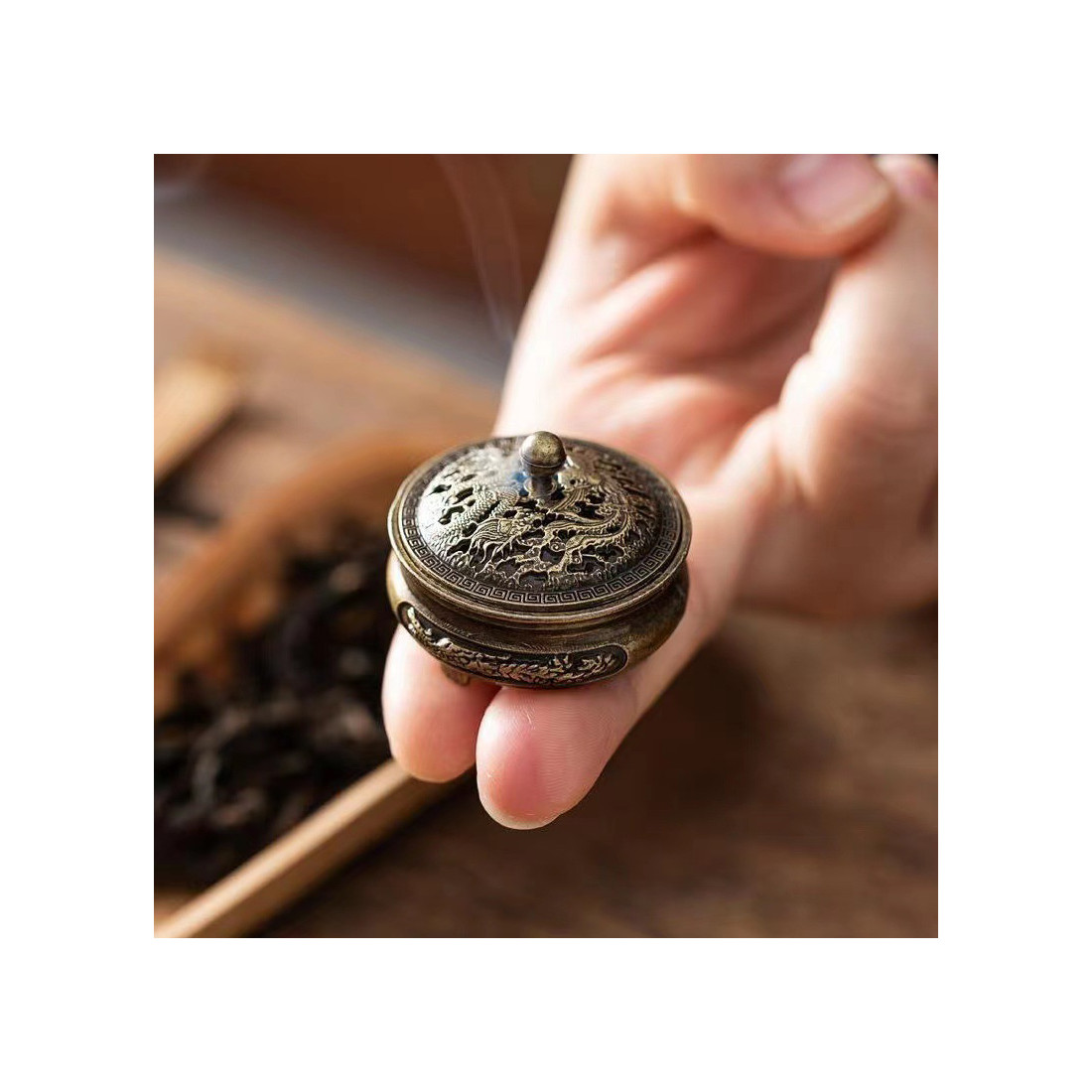 На кришці та боках зображені дракон та фенікс.
