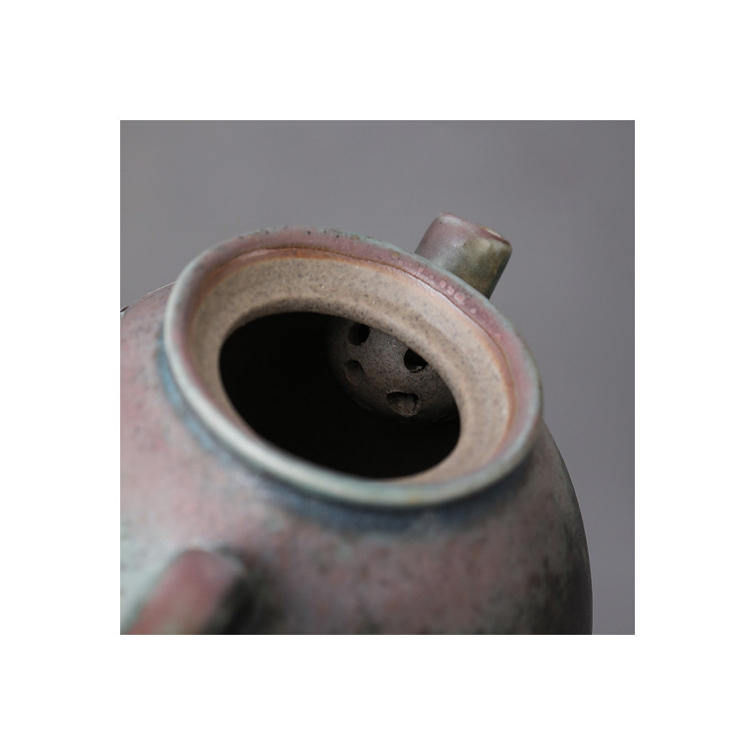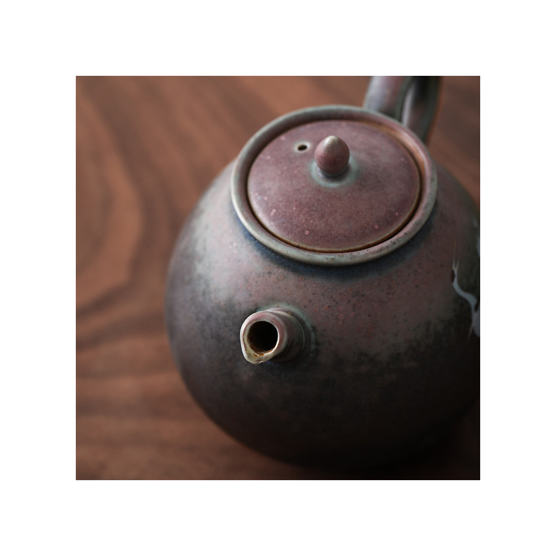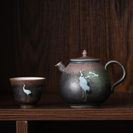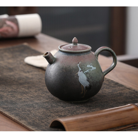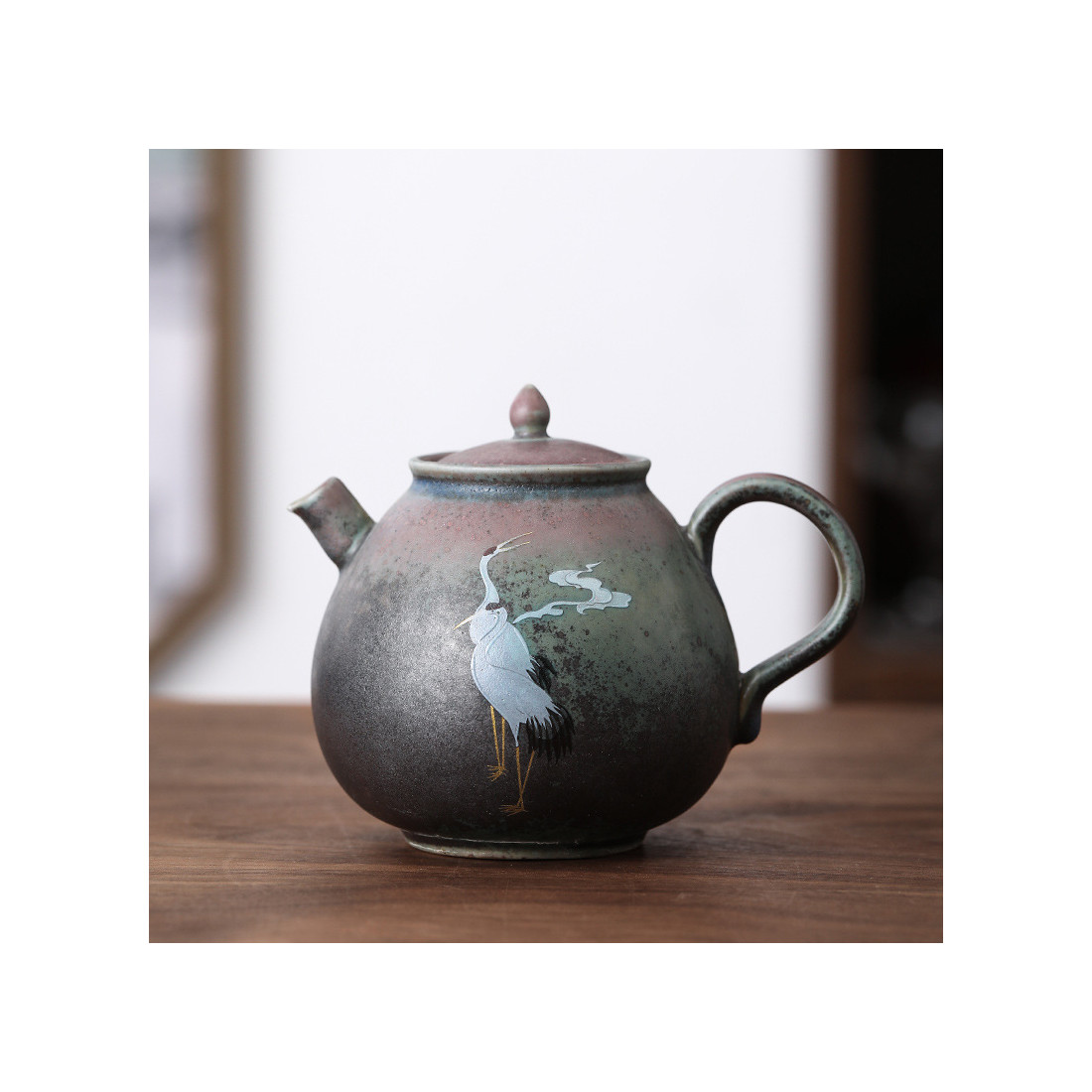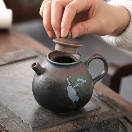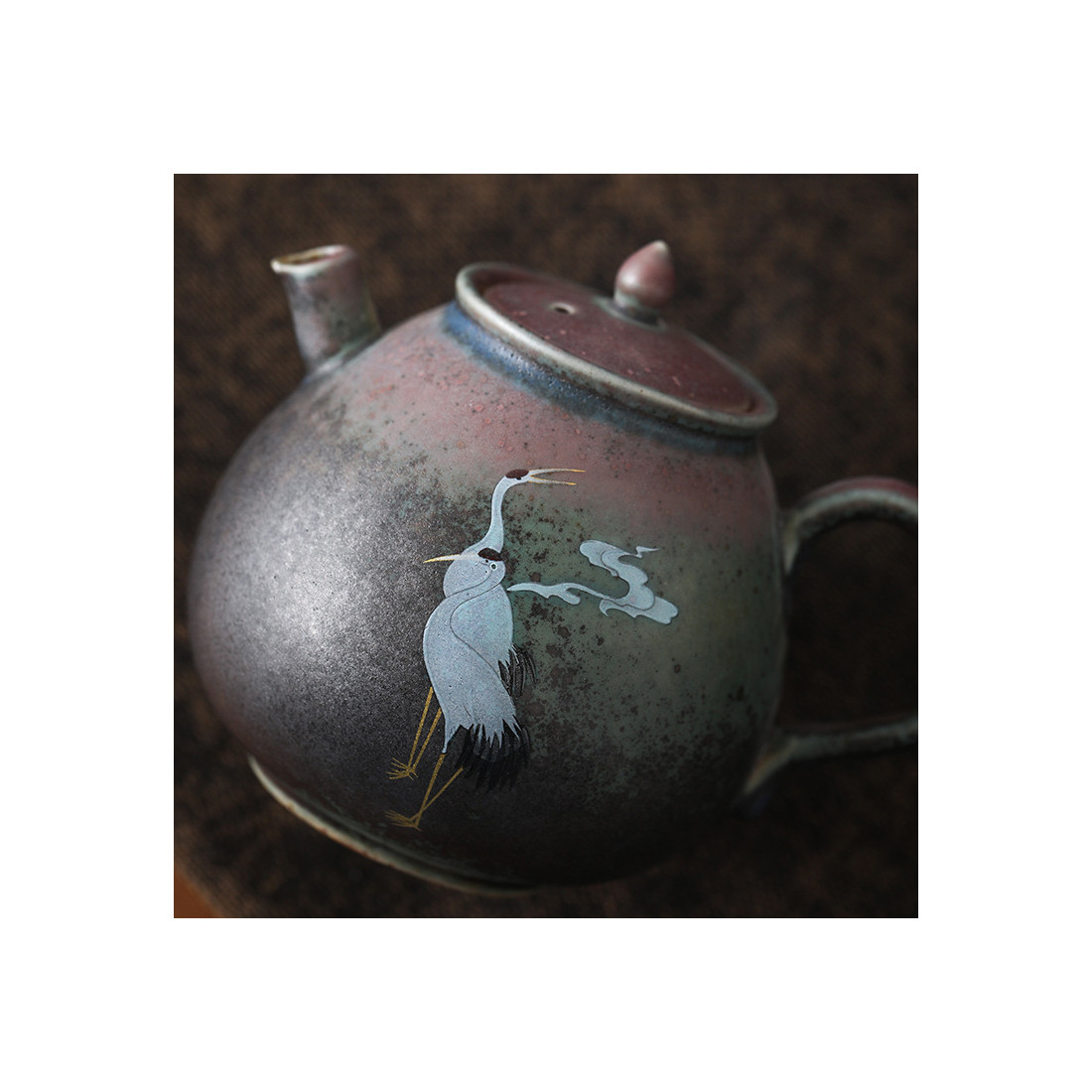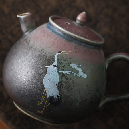 Так як покриття чайника з ефектом яобянь, тобто в печі утворюється остаточний малюнок і колір глазурі, всі чайники трохи відрізняються за забарвленням, але зберігають малиновий, золотистий і зелений відтінок, показаний на фотографії. Малюнок — аплікація.
