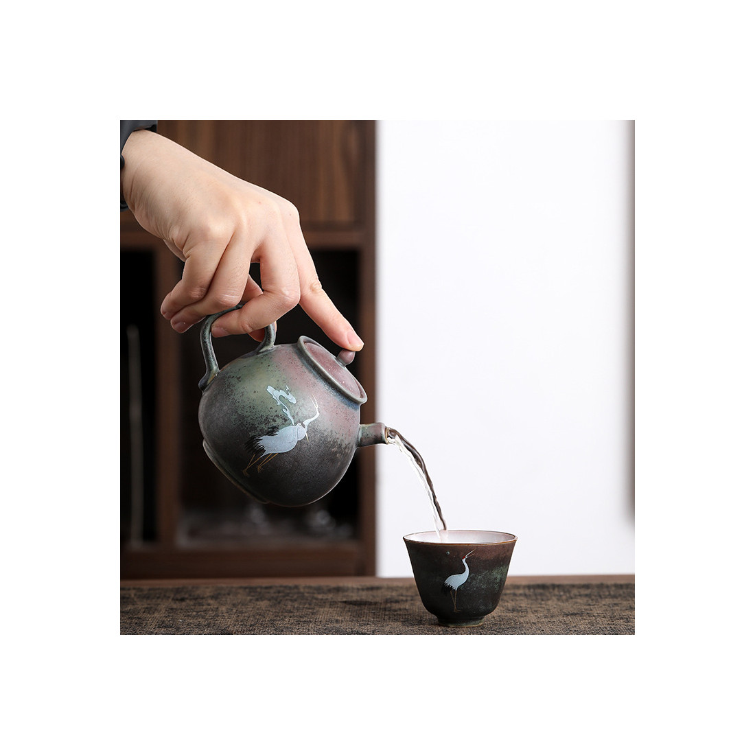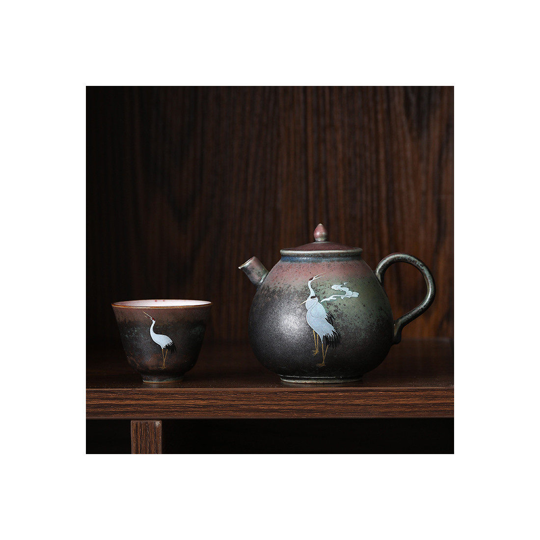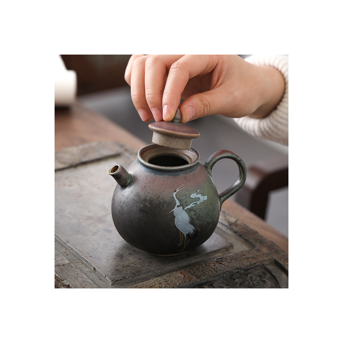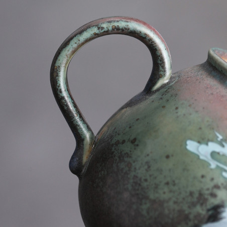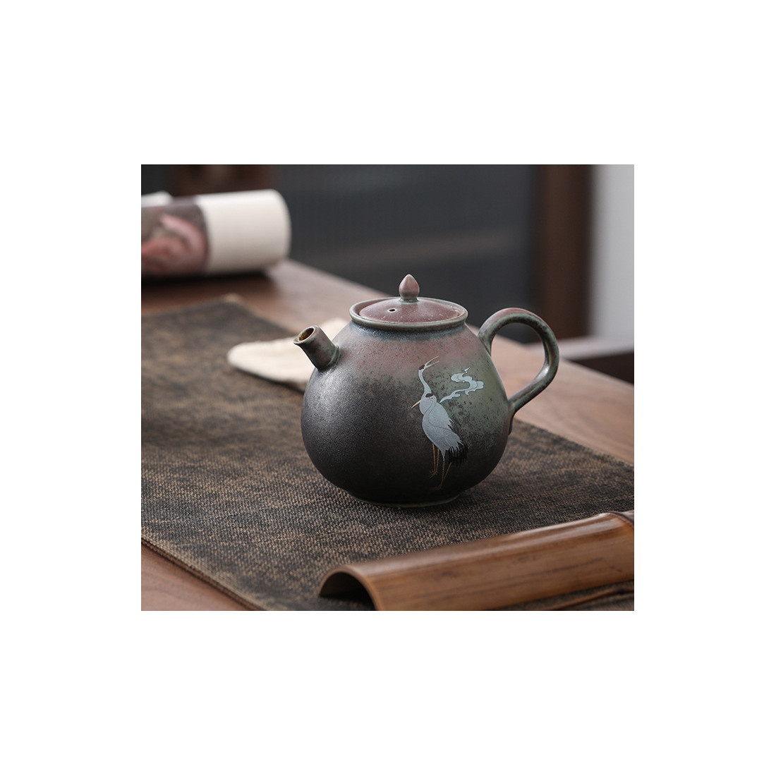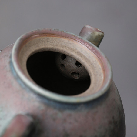 Так як покриття чайника з ефектом яобянь, тобто в печі утворюється остаточний малюнок і колір глазурі, всі чайники трохи відрізняються за забарвленням, але зберігають малиновий, золотистий і зелений відтінок, показаний на фотографії. Малюнок — аплікація.
