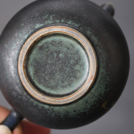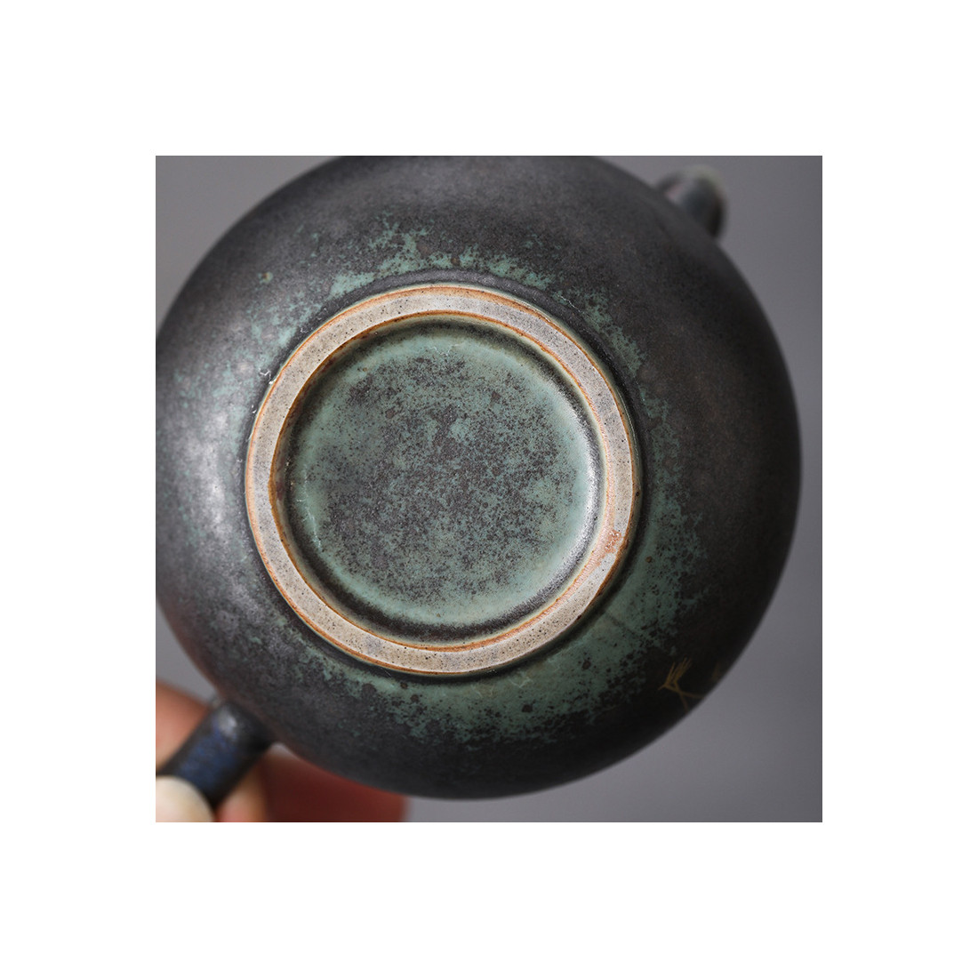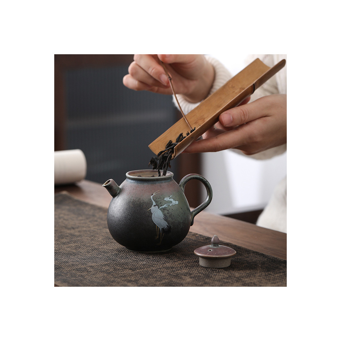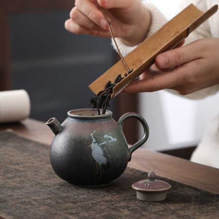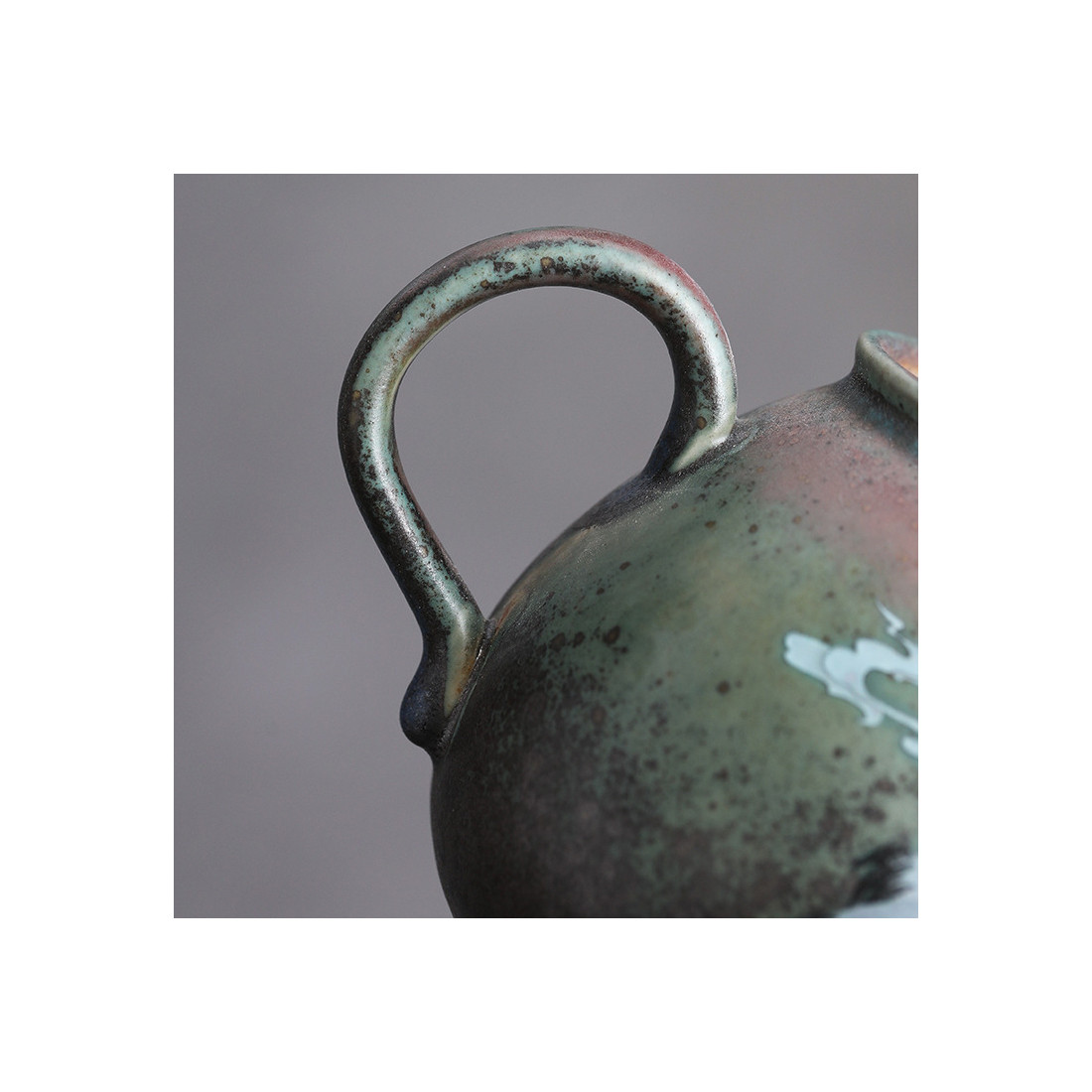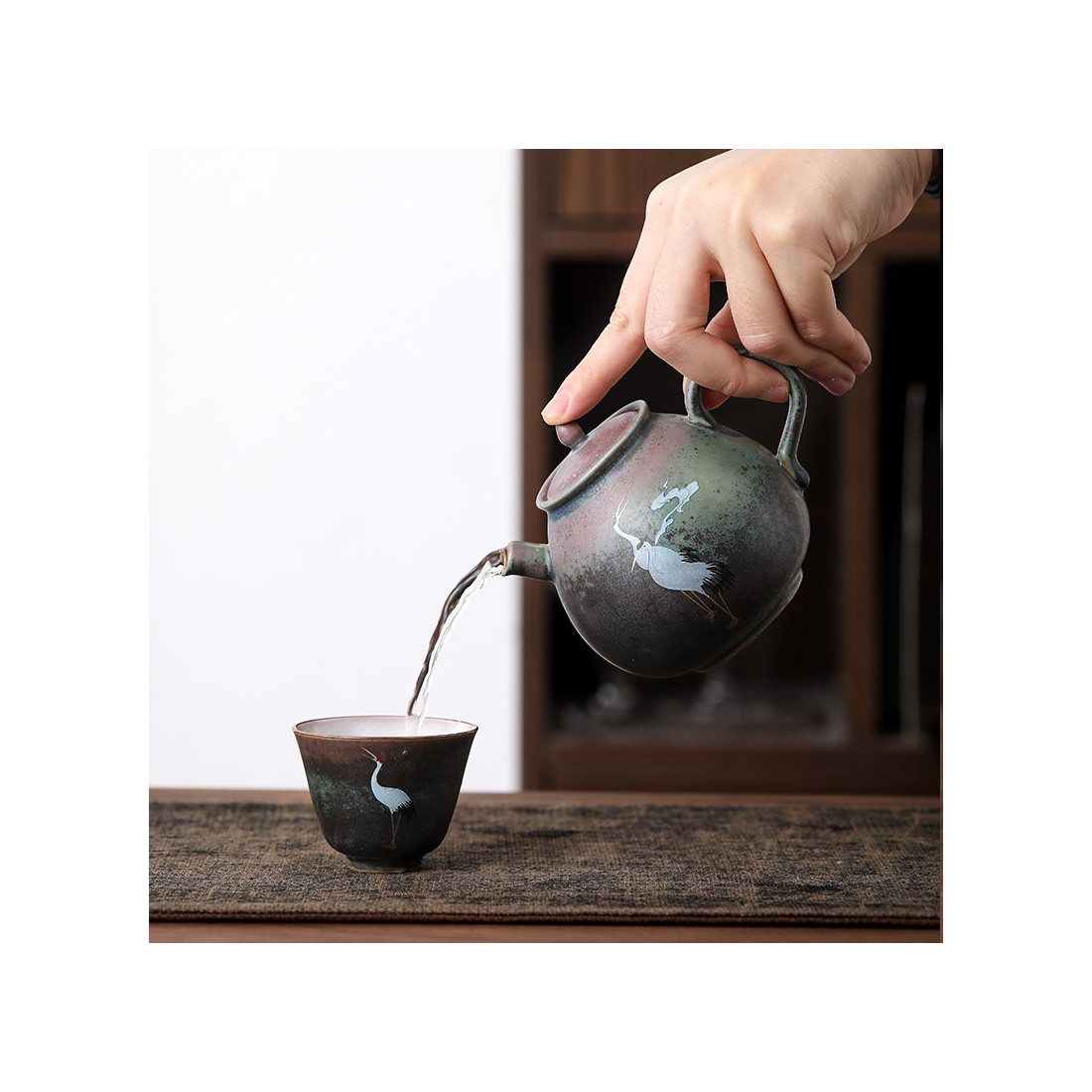 Так як покриття чайника з ефектом яобянь, тобто в печі утворюється остаточний малюнок і колір глазурі, всі чайники трохи відрізняються за забарвленням, але зберігають малиновий, золотистий і зелений відтінок, показаний на фотографії. Малюнок — аплікація.