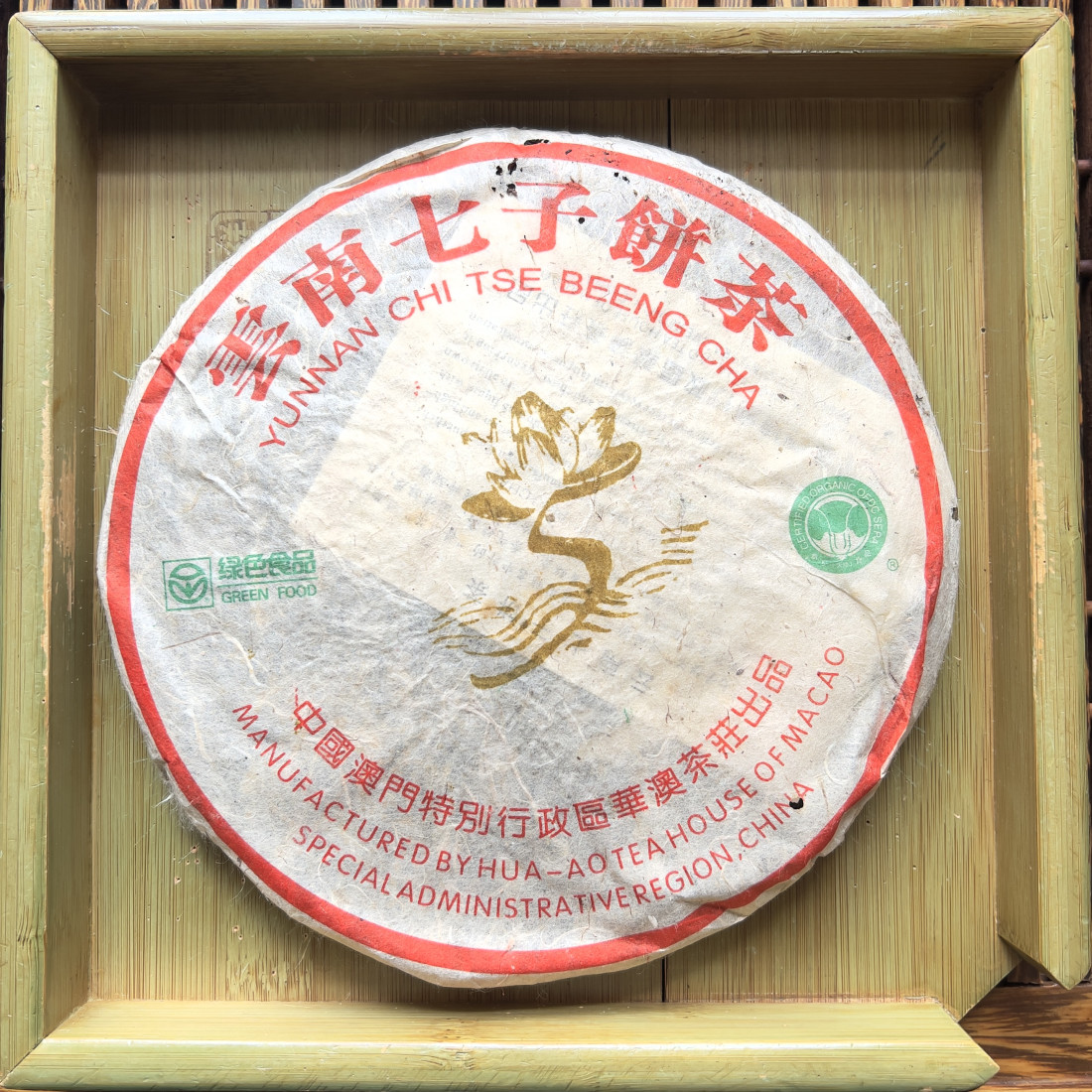 Раритетний шен пуер від чайного дому Хуа-Ао із Макао. Цінність цього млинця набагато більша, ніж нам вдалося купити. Такі чаї можна зустріти на чайних аукціонах, але іноді і в скромній хатині невеликого складу в Юньнані.