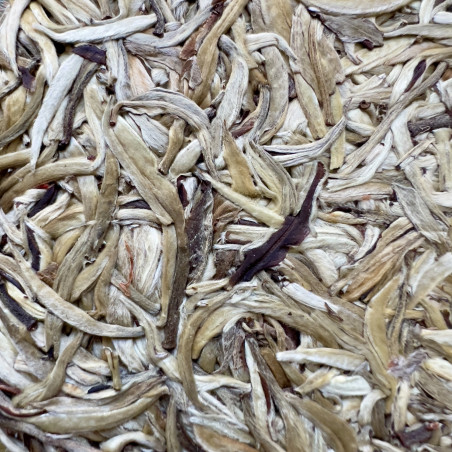 З давніх часів чай використовували як ліки та сушили нарівні з іншими цілющими травами. Досі в Китаї до білого чаю, а особливо до витриманого, ставляться як до еліксиру молодості та довголіття. Тому в горах Тай Му Шань чайне листя просто збирали і сушили, не обсмажуючи, а потім заварювали окропом. Приблизно на рубежі 16 століття, коли почали з'являтися різні види чаїв, а технології виробництва намагалися записувати та закріплювати, фуцзянський чай, зібраний з кущів з довгим і густим ворсом, отримав назву «білий чай». Названий він був за своїм зовнішнім виглядом. До початку 20 століття збирали лише бруньки – «Срібні голки». Подивіться на них - інакше, ніж білими та срібними, їх назвати важко.