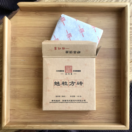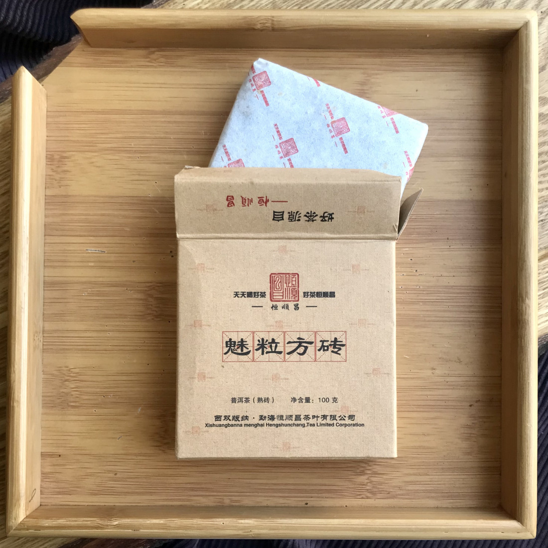 З одного боку на квадраті видавлено назву фабрики - Хен Шунь Чан, з іншого - плитка, допомога у розподілі квадрата на порції. Упакований у гарну картонну коробку, а для кращого збереження малюнка додатково обернуто у папір. Вага лише 100 грам.