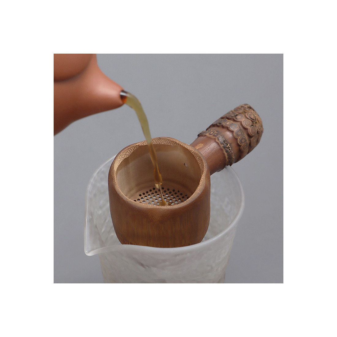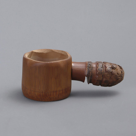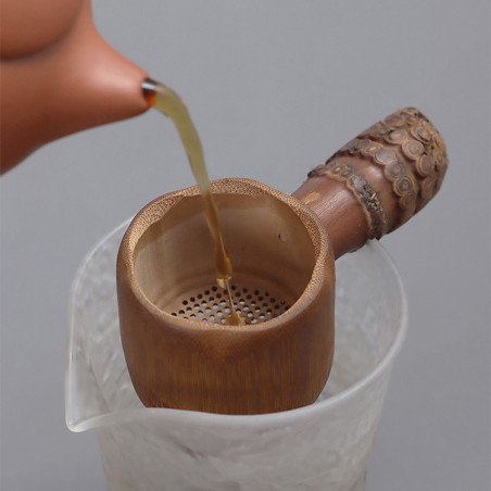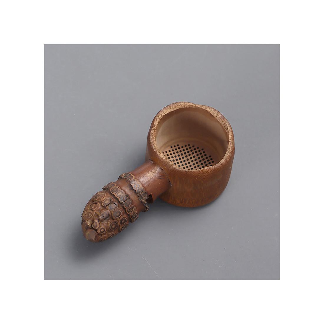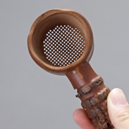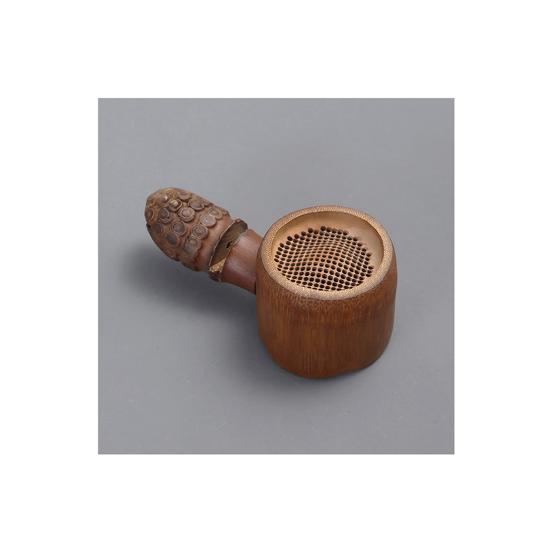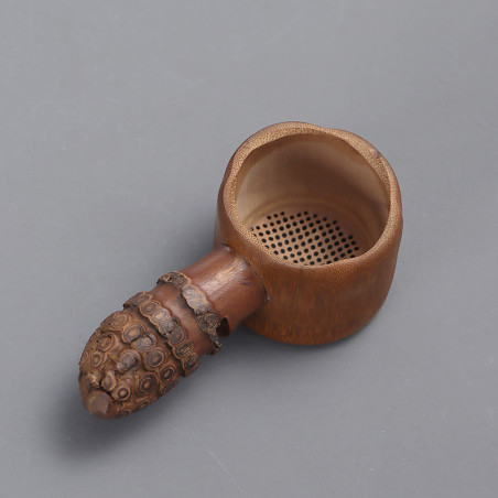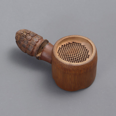 Сито виготовлене з натурального бамбука, ручка з кореня бамбука. Для зливу води в природному перешийку коліна бамбука пробиті дірочки. На ручці зроблено заглиблення, щоб зачепити сито за край чахаю. Це традиційний старий стиль.