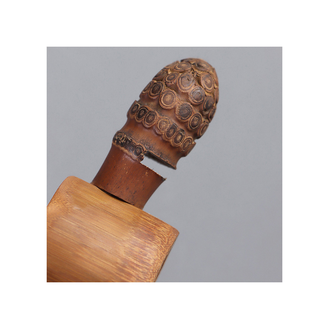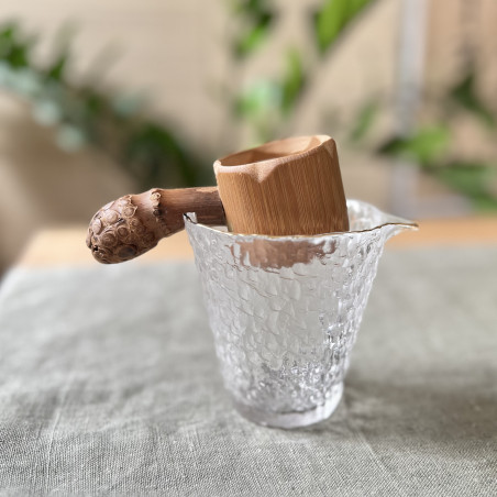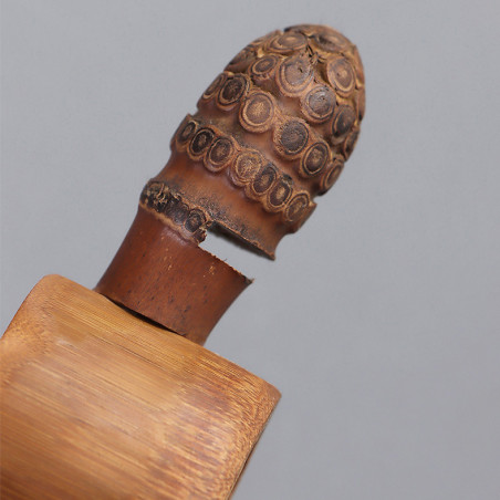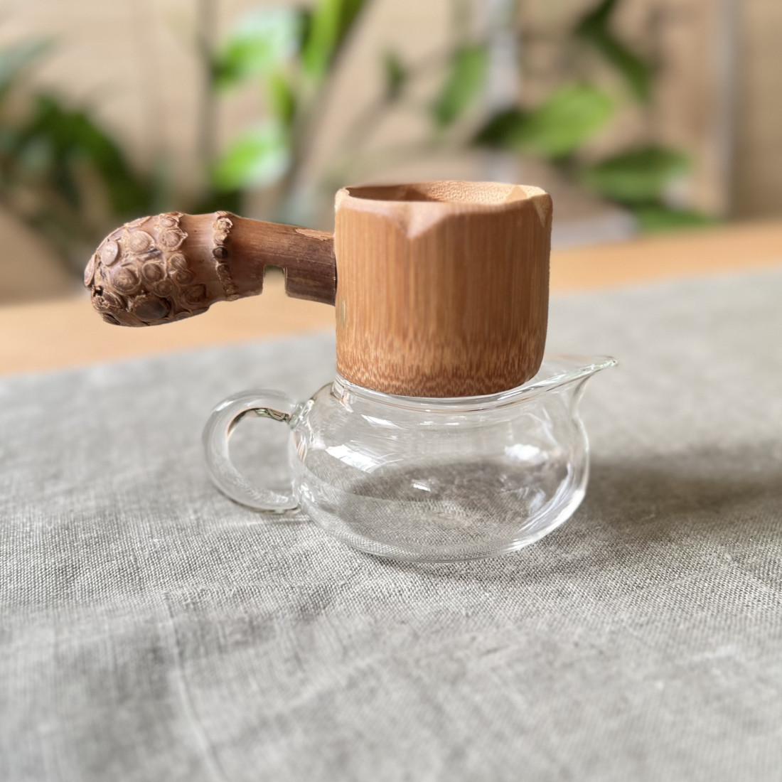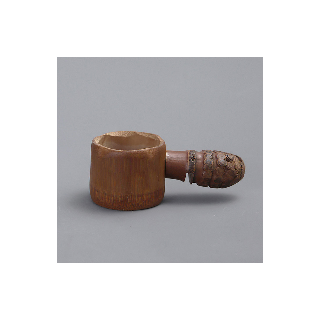 Сито виготовлене з натурального бамбука, ручка з кореня бамбука. Для зливу води в природному перешийку коліна бамбука пробиті дірочки. На ручці зроблено заглиблення, щоб зачепити сито за край чахаю. Це традиційний старий стиль.