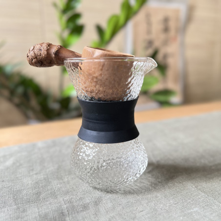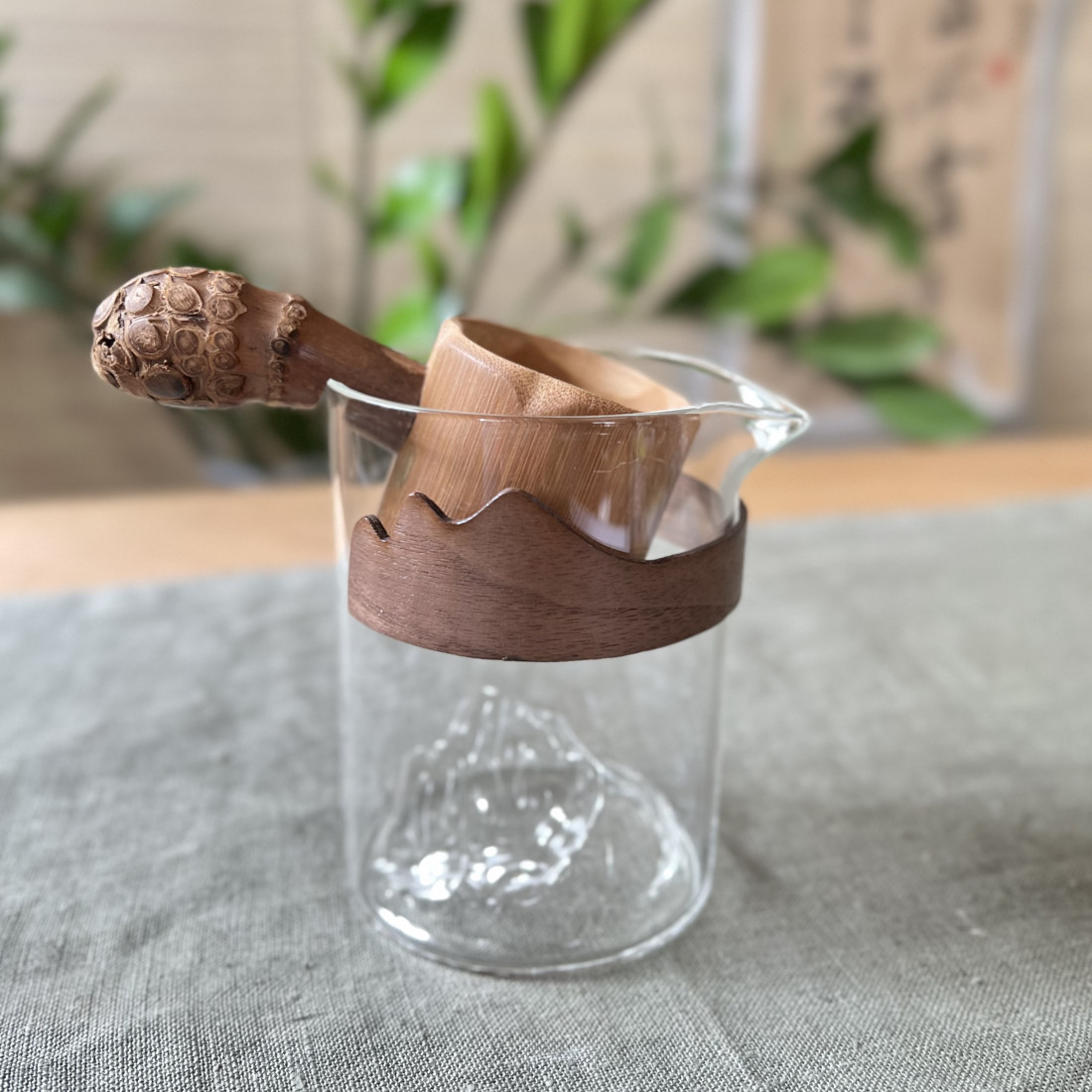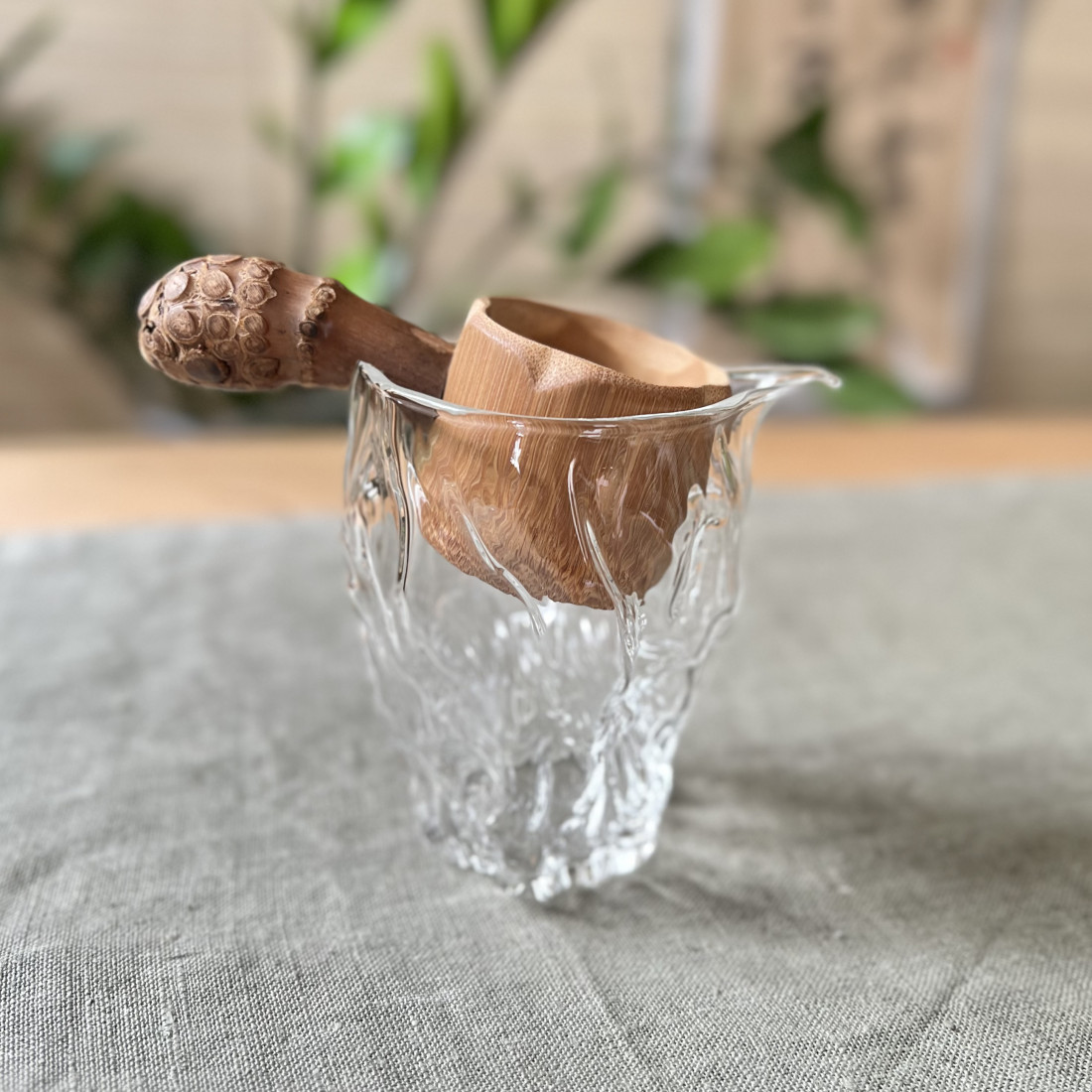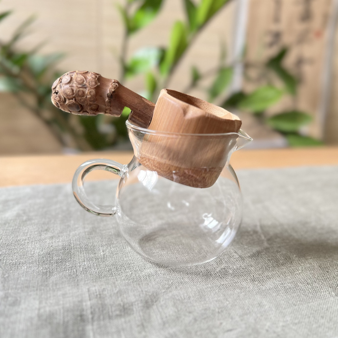 Сито виготовлене з натурального бамбука, ручка з кореня бамбука. Для зливу води в природному перешийку коліна бамбука пробиті дірочки. На ручці зроблено заглиблення, щоб зачепити сито за край чахаю. Це традиційний старий стиль.