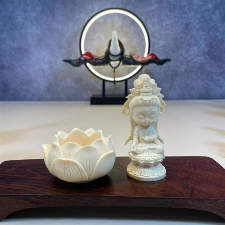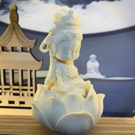 Це складна статуетка. Цілісний образ: Ґуаньїнь на лотосі, але богиню можна поставити поруч, а лотос використовувати як свічник для чайної свічки.