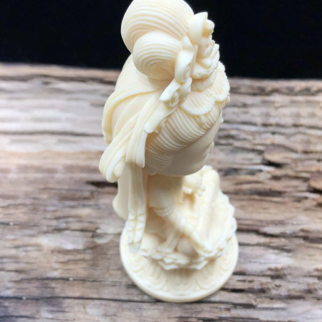 Статуетка вирізана з горіха тагуа, який називають рослинною слоновою кісткою. Горіх теплого білого кольору, щільної структури, що зовні нагадує бивень слона.