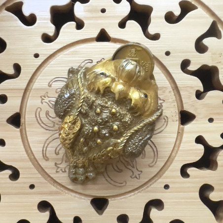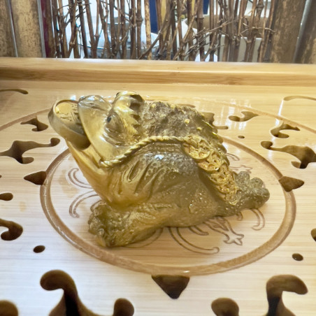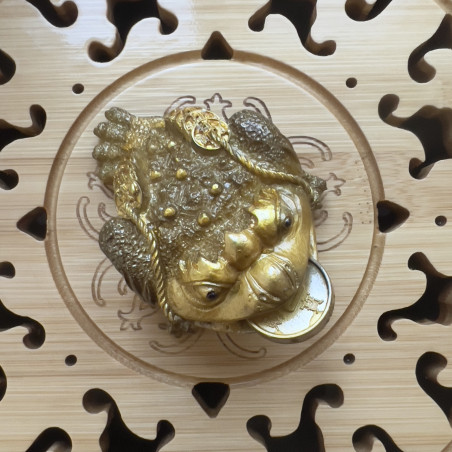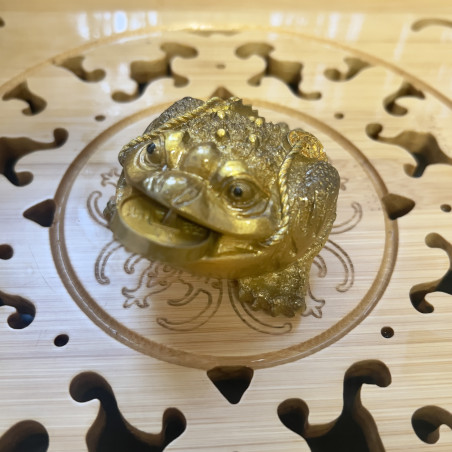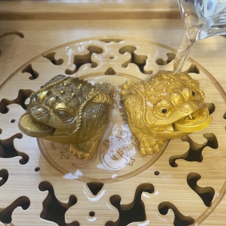 Статуетка із пластику. У звичайному стані — бронзового кольору, але якщо полити жабу окропом, вона змінить колір на золотий. При охолодженні повернеться початковий колір.
